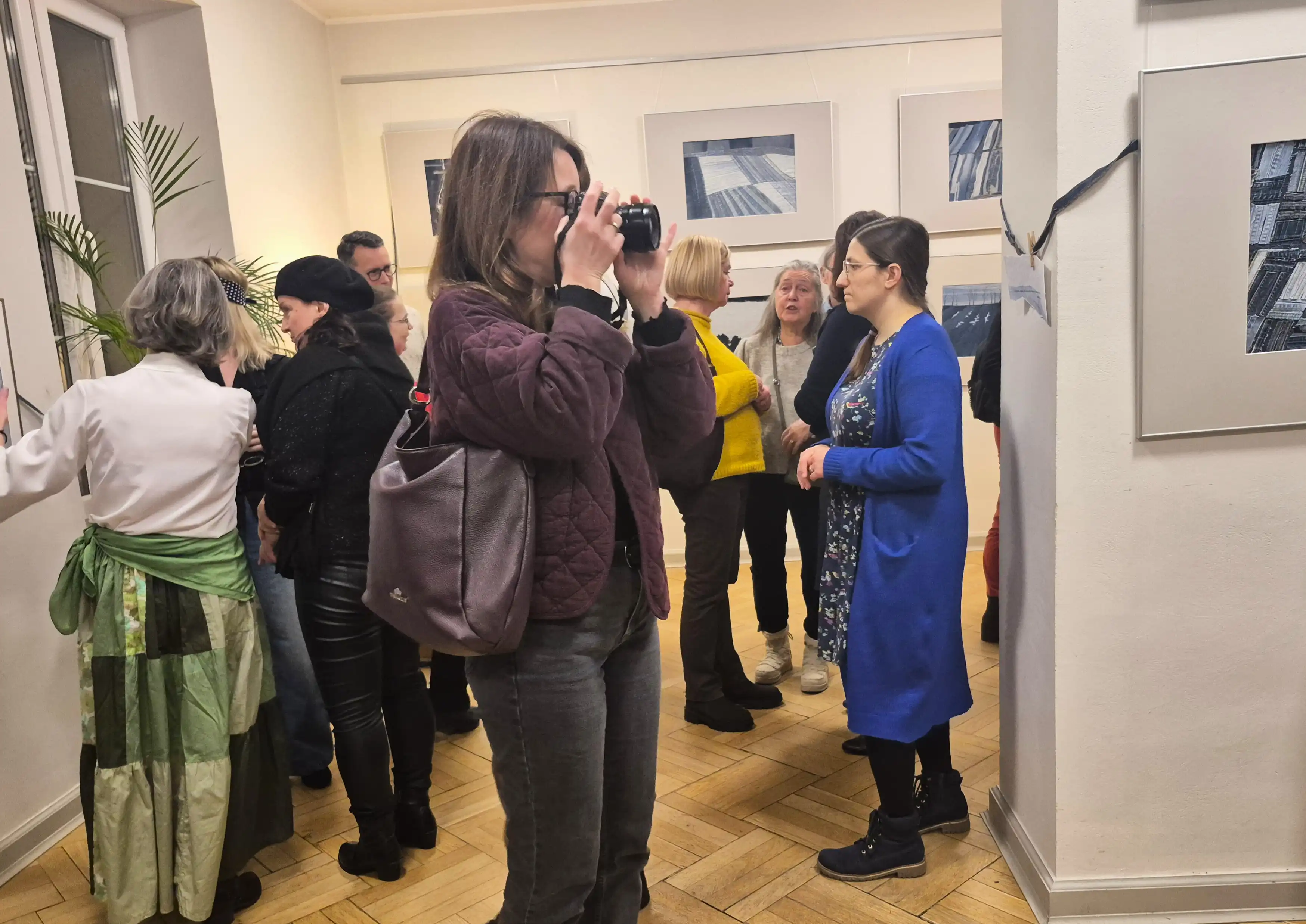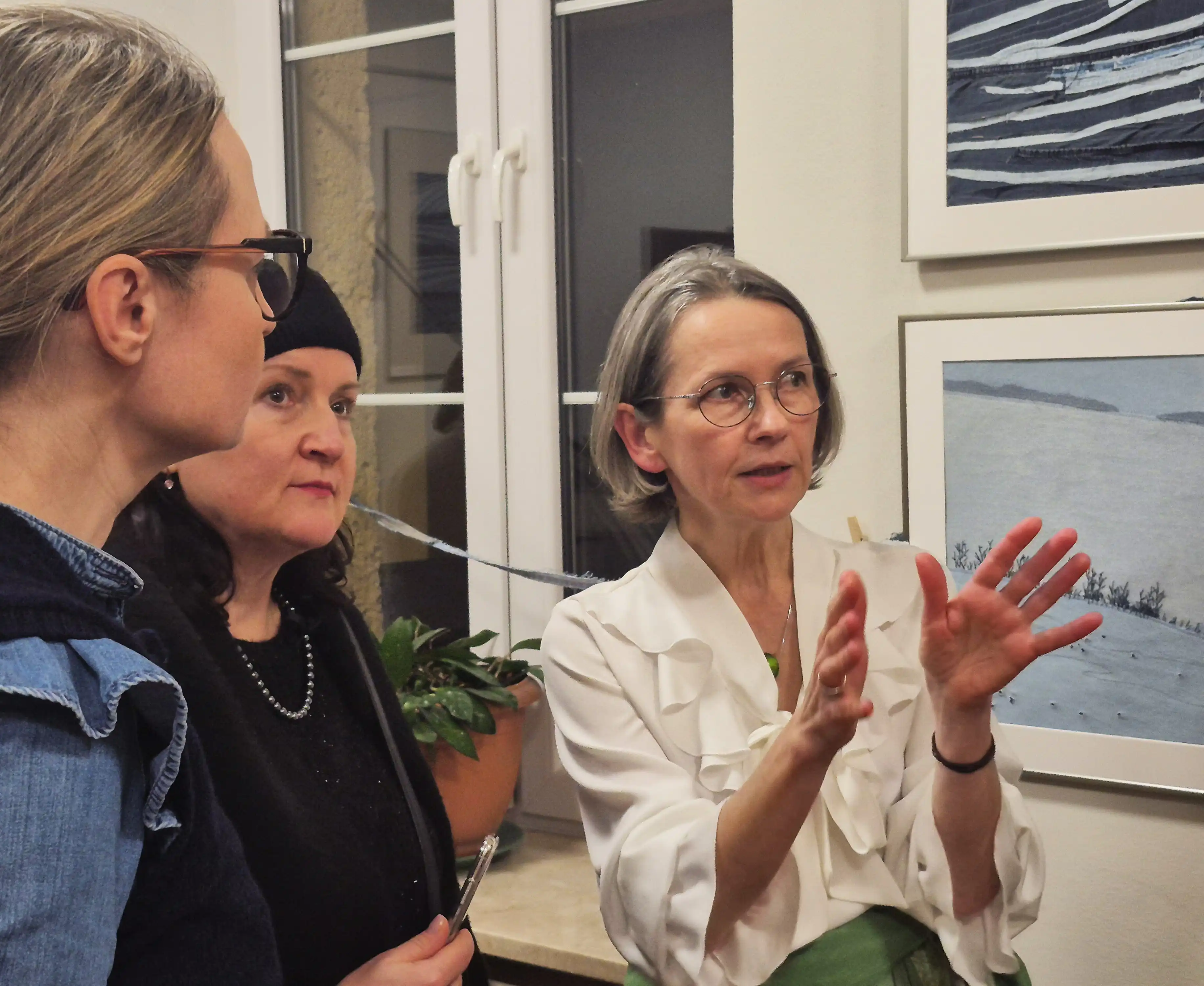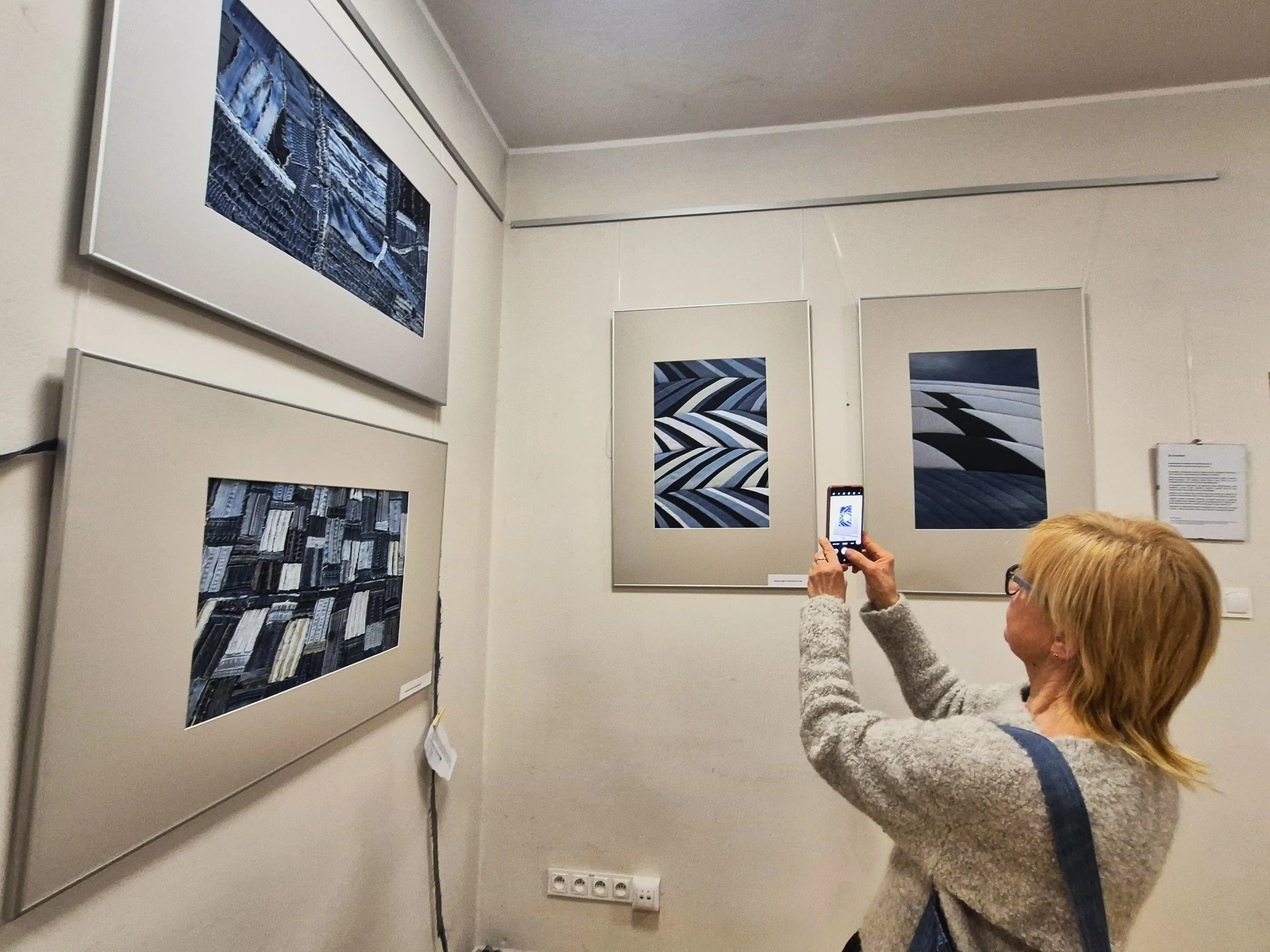 Agata opowiedziała gościom, że pomysł na uszycie takich prac narodził się podczas pandemii, gdy było aż za dużo czasu na twórczość. Wtedy zapragnęła nowego wystroju wnętrz, najlepiej bez kupowania nowych rzeczy, realizowanego z poszanowaniem natury, uszytych ze starych znoszonych ubrań. A że od lat zachwycają ją fotografie Kieleckiej Szkoły Krajobrazu, postanowiła się nimi zainspirować. Jako tworzywo wykorzystała stare wytarte dżinsy, które dobrze oddają specyfikę czarno-białej fotografii, wnosząc dodatkowo przez swój odcień pewien klimat nostalgii.